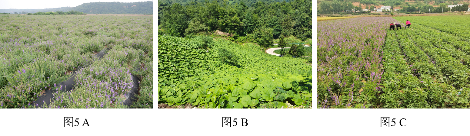 课题组在陕西多个地方建立中药材规范化栽培基地,落实“药材好,药才好”这个朴素的标准,从源头控制药材质量,建立药材基地,探索最适宜的栽培方式,保证药材生产质量,继而规模化推广,这对药材品质提升有重要意义。在关中地区推广黄芩起垄覆膜技术增产显著,栽培过千亩(图5 A);在陕南地区推广大黄、五味子等规范化栽培面积过千亩(图5 B);在关中地区推广丹参起垄覆膜、剪花技术增产显著。(图5 C)。
