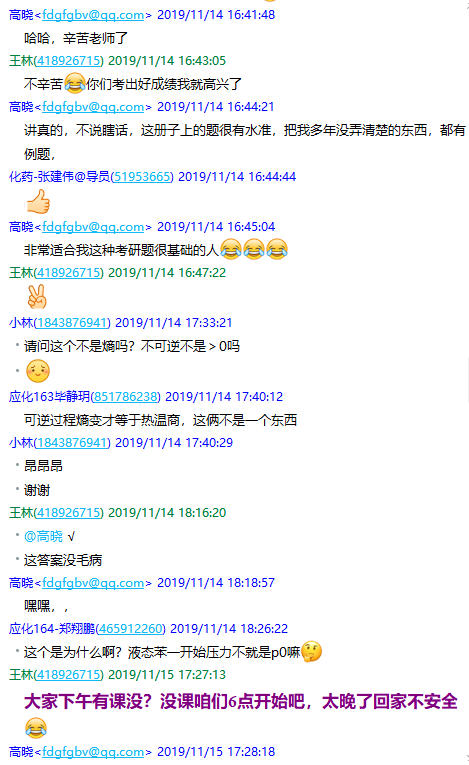 本人在执教物理化学的十余年间,一直关注学生考研情况,坚持每年义务辅导有考研需要的学生,帮助他们选择专业和备考,有着丰富的经验。近5年来,物理化学在研究生入学考试中所占的比重越来越大,因此越发受到学校和直播网 的重视。为此,本人于2019年联合了兰州大学、吉林大学、东北师范大学、陕西师范大学、长安大学等五所名校的几位一线教师,将《物理化学》中的重点、难点、考点问题以及大量学习资源进行分类整合,编纂了一本《<物理化学>类型题训练及解析》,作为我校学生的考研辅导材料,并利用业余时间在线下集中辅导考研学生,讲解难题、传授答题技巧。同年底,应用化学2016级本科生考研通过率显著提高,学生普遍认为这次集中辅导的作用非常大(图6)。在本人的悉心辅导下,在课题组做毕业设计的5位本科生全部都考上了一流高校和科研院所(吉林大学、同济大学、中科院长春应化所)。