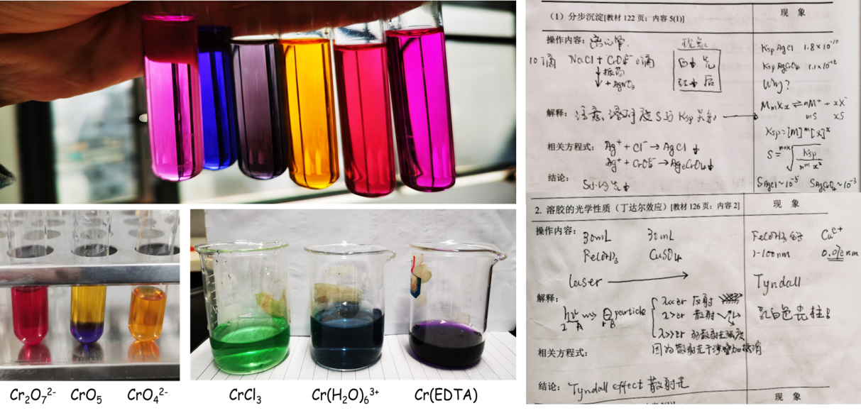 元素实验定量预测;学生做预习报告时,需要通过定量计算先预测实验结果,再进行实验现象验证。例如,往同浓度的Cl−与CrO42-中加入Ag+,两种沉淀颜色不同(AgCl白、Ag2CrO4砖红),实验前查溶度积(Ksp(AgCl)=1.8×10-10,Ksp(Ag2CrO4)=1.1×10-12)并计算溶解度(S(MaXb)a+b=Ksp/aabb),在比较数值大小后(SAgCl< SAg2CrO4)预测现象——沉淀顺序为白先红后,这与实际观测相符。在NaCl和NH4Ac溶液pH值测定实验中,预测二者pH值均为7,然而,实际观测的现象却是NH4Ac(aq)数值为7,NaCl(aq)略小于7(室温pH计测定约6.63)。看似理论与观测不符,其实内有玄机。由于配制溶液的溶剂为离子交换树脂得到的去离子水,其中含有少许有机酸,因此NaCl的数值属于正常现象,而双水解的NH4Ac可以起到缓冲溶液的作用,因而,pH值≈7。这既体现了真实记录与现象预测的必要性,又印证了一句名言:“机会只偏爱那些有准备的头脑。”