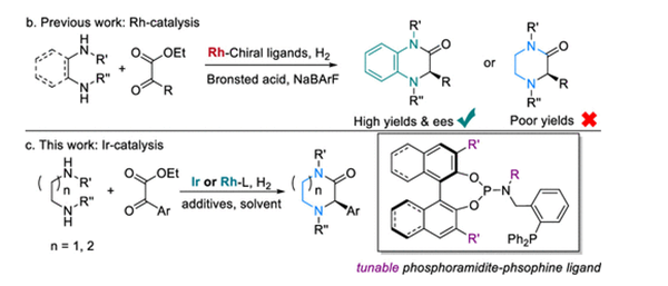 手性哌嗪酮是一类非常重要的药物活性单元。本研究利用简单的脂肪二胺与α-酮酸酯为原料,通过铱/铑催化的不对称还原胺化与酰胺化串联反应合成手性哌嗪酮。本方法克服了脂肪二胺对过渡金属催化剂的抑制作用,原子利用率高,简洁高效。实验室自主开发的亚磷酰胺双膦配体库结构多样,电性、空间位阻可调,展示了高度的灵活性和催化效率。