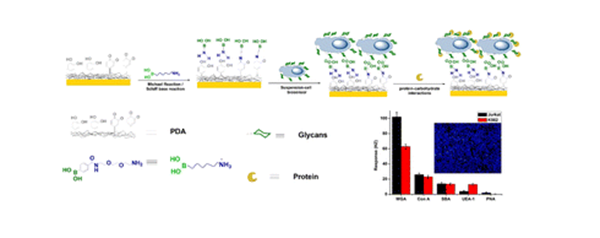 基于石英晶体微天平(QCM)技术的细胞生物芯片能够将细胞固定到芯片表面,进而对其细胞膜表面糖基化以及分子与细胞相互作用进行检测,是一种研究细胞表面分子识别的重要技术手段。对于贴壁细胞,通常可以利用其贴壁生长的特性使其粘附到芯片表面。然而,与贴壁细胞相比,悬浮细胞由于其悬浮生长的特性,很难将其直接粘附到芯片表面。本研究将合成的苯硼酸衍生物(PBA)共价连接到聚多巴胺修饰的QCM芯片表面,通过悬浮细胞表面糖环上的顺式二醇结构与芯片表面PBA中的苯硼酸基团形成动态可逆的硼酯键,将悬浮细胞固定到芯片上制得QCM悬浮细胞生物芯片,为悬浮细胞芯片的制备提供了一种新方法。利用该方法,我们成功制备两种悬浮肿瘤细胞(人急性淋巴白血病细胞 Jurkat和人慢性髓原白血病细胞K562)芯片,并对上述两种细胞表面糖基化及其与凝集素相互作用的动力学进行了深入研究,为研究悬浮细胞表面的糖基化及其表面复杂的分子相互作用提供了一种新方法。