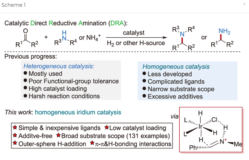 直接还原胺化(DRA)是合成胺类化合物的最有效方法之一。研究团队利用铱和简单廉价的三苯基膦及类似配体作为催化剂,将醛酮与胺源(伯胺、仲胺或者铵盐)高效地还原偶联生成结构和功能多样的胺产物。该反应采用清洁的氢气作为还原剂,反应条件温和,催化剂用量低(最低为0.003 mol%),且对含有不同官能团的底物耐受性表现优秀。理论计算表明,在加氢的关键步骤中铱上的氯与亚胺上的质子之间存在的氢键作用力客观上稳定了过渡态,从而促进了反应的进行。在优化条件下,多种市售药物可以被高效、高产率制备。十克规模级的产物制备也进一步证明了该方法在工业合成中的潜力和前景。